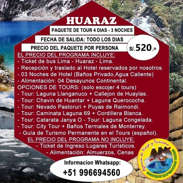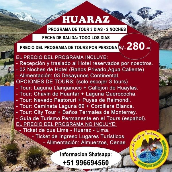 Paquete Tours Económico 4 días 3 noche Huaraz, Operadores especializados en la organización de Paquete Tours Económico 4 días 3 noche Huaraz, contamos con un equipo de profesionales de experiencia laboral en el campo de Turismo en Huaraz, cuyo objetivo principal es brindar calidad, seguridad y garantía en todos nuestros servicios.