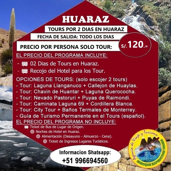TOURS EN HUARAZ, Operadores especializados en la organización de Tours en Huaraz, contamos con un equipo de profesionales de experiencia laboral en el campo de Turismo Convencional, cuyo objetivo principal es brindar calidad, seguridad y garantía en todos nuestros servicios, de esa manera, cumplir con las expectativas y exigencias del Cliente.